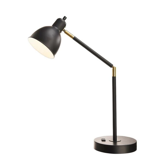 Illuminate your work area with this Aalestrup desk lamp from Carson Carrington. Crafted from metal with a black finish, the lamp features a round base with a power outlet, an adjustable arm with brass accents, and a metal shade with an on-off switch. The single bulb lamp allows you to direct the light towards the area you need it most, and the traditional look will work well in a variety of decors.