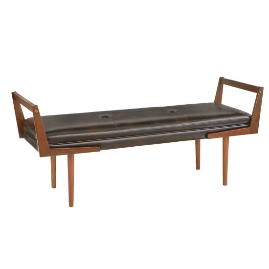 The Ahteri Mid-Century Upholstered Bench is a sophisticated accent in any room. Β Perfect for the living room, entryway or bedroom. Β A mix of fabric and wood, combined with clean, distinctive lines, give this bench its Mid-Century modern allure. Β The seat is upholstered in our choice of Brown supple faux leather or textured fabric in Taupe or Charcoal Grey. Β The armrests and legs are crafted of solid Rubberwood in a dark Walnut finish. Β Seat upholstery features stitching detail and two stately button tufts for added interest.