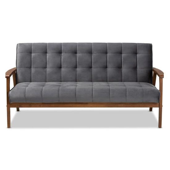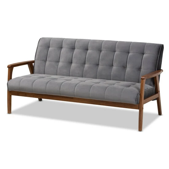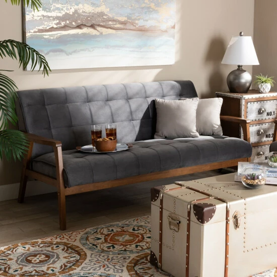 Show off your chic style with the Asta mid-century modern sofa. The sleek, low-profile frame is made from solid rubberwood for beauty and durability, and the thick, foam-padded cushions feature biscuit-tufted details for an upscale touch. With a warm walnut finish and neutral-colored velvet upholstery, this sofa offers a versatile, contemporary look.