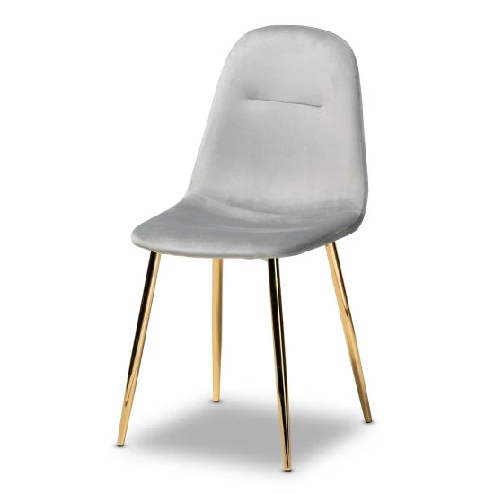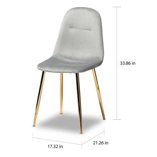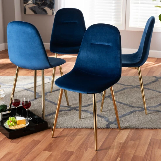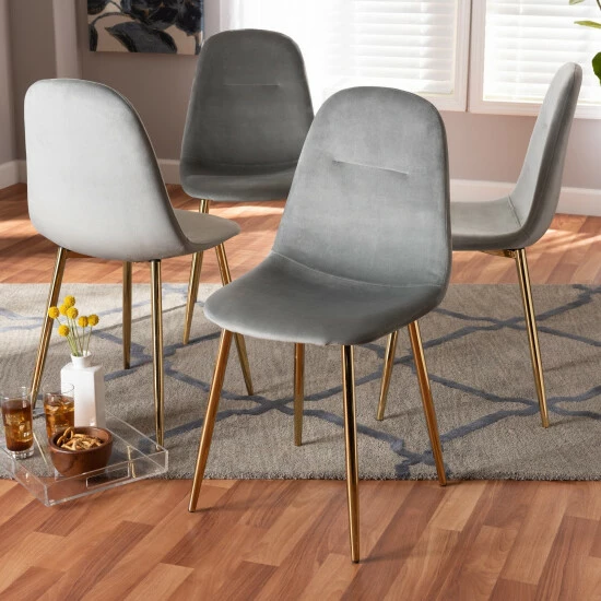 Enjoy comfortable seating during your next dinner party with this set of four upholstered dining chairs. Upholstered in plush velvet fabric, these chairs look glamorous when paired with any dining room table. Each chair features a bucket seat to relax into and angled goldtone legs to give it a mid-century modern look.