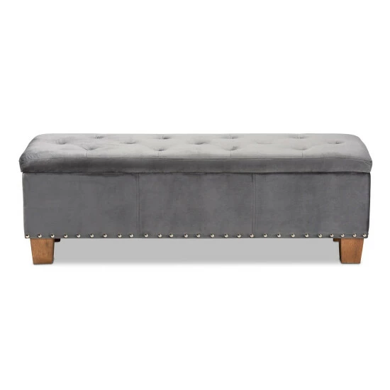 Store blankets or board games in Baxton Studio’s Hannah storage ottoman bench. Wood construction ensures durability while the plush velvet upholstery and foam padding provides comfort as extra seating. The lift-top storage compartment gives ample space for storage, and the sleek design with classic tufting and nailhead trim lends a modern look to your living room.
