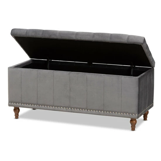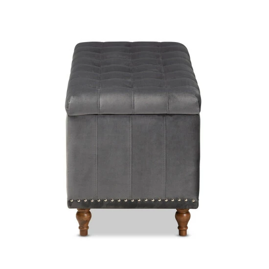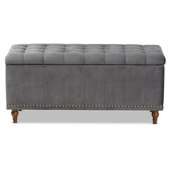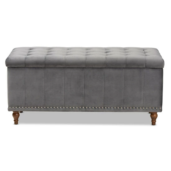 Complete the look of your living room by placing this ottoman bench against a wall. Along with a nailhead trim, this ottoman bench features button tufting, grid stitching, and turned legs for visual elegance. Constructed from solid rubberwood and MDF, this sturdy ottoman offers a convenient way to store extra pillows and throws neatly.