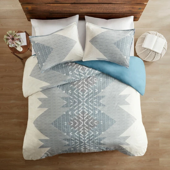 This duvet cover mini set plays with color and dimension to give your bedroom an urban update. The duvet cover showcases a global inspired geometric design in various blue hues. A depth of dimension is conveyed with the rustic, chevron printed texture that is consistent throughout the duvet cover. Two matching shams are included to complete this set. For a clean look for any room in your home, this duvet cover features a button closure. Set includes one duvet cover, two matching shams.