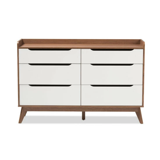 Organize your clothing in style with this two-toned white and walnut dresser. The light brown frame features angled legs and six smooth-glide drawers to store all of your apparel and accessories. Line succulents and jewelry along the top shelf for a personal touch.