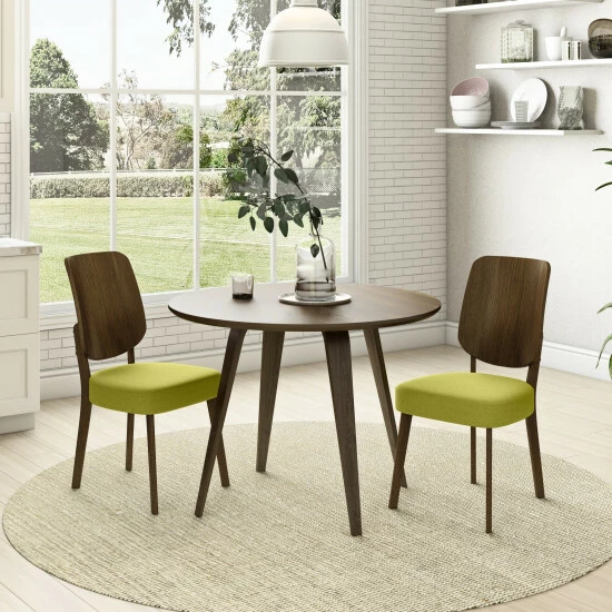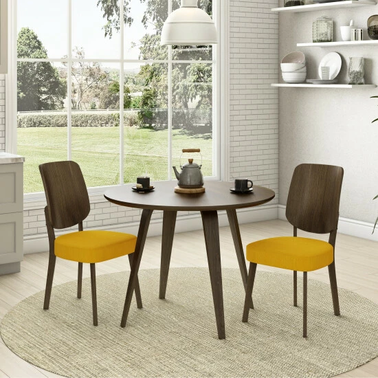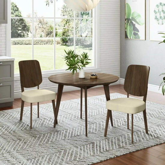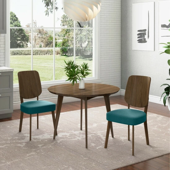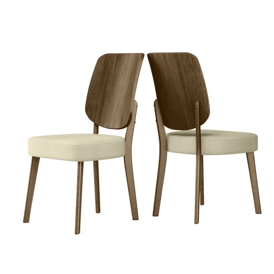 Classic and understated, this set of 2 armless side chairs celebrates the clean lines and simple design elements of the mid century modern movement. Gently rounded square backs with walnut veneer provide and thickly cushioned upholstered seats provide style and comfort. Perfectly proportioned, these chairs are suited for use in the dining room, office, kitchen or anywhere an extra seat is needed