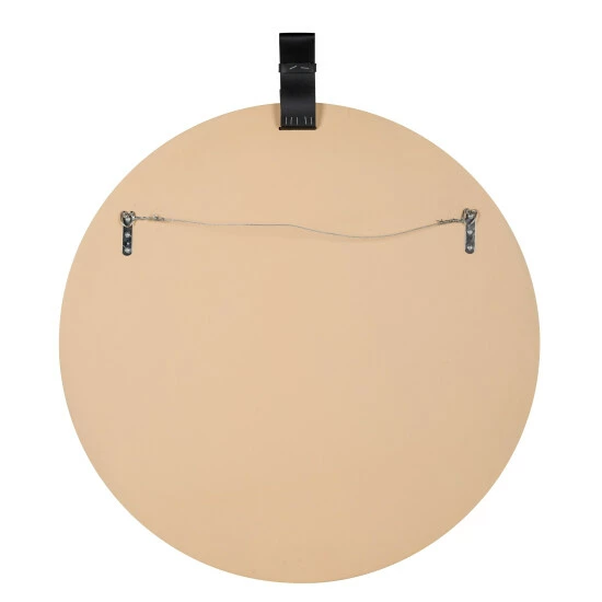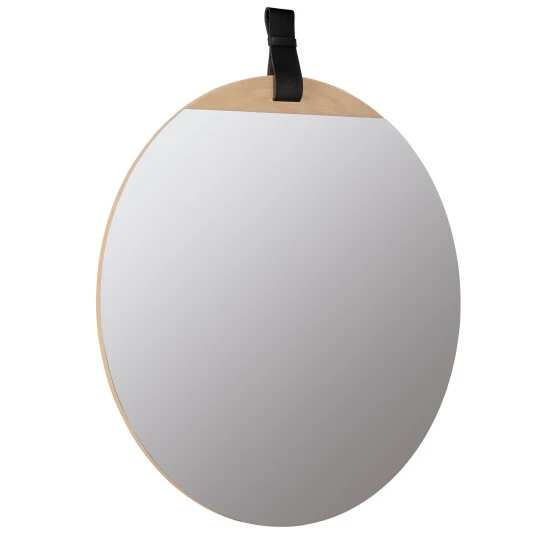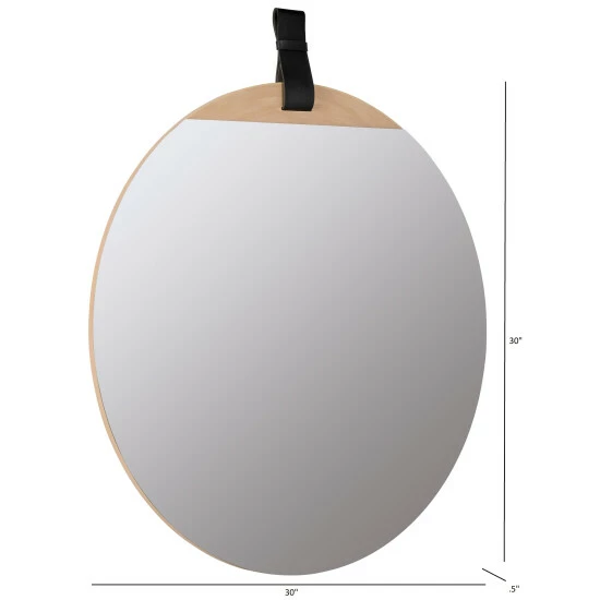 Classy and contemporary, this round wall mirror will open up your space. This mirror features a blonde wood finish with a black leather accent strap at the top for a fashion-forward touch.