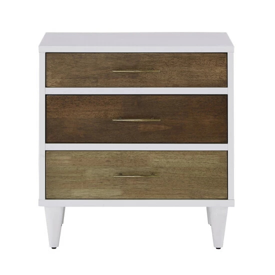 Give your bedside a transitional update with the Christian 3-drawer Nightstand. This generous nightstand comes with three drawers of varying sizes and natural finishes that create a unique and contemporary look. The tapered legs and frame of the nightstand is finished in a clean white color that stunningly complements the natural finishes on the drawers. Each drawer features beautiful gold metal hardware accents so you can always have easy access to your belongings without leaving your bed. This sophisticated nightstand is expertly crafted from rubber wood, veneer, and acacia, making it tough to crack and easy to clean for everyday use. Pair this with the Prudence 8-Drawer dresser for the complete look in your bedroom.