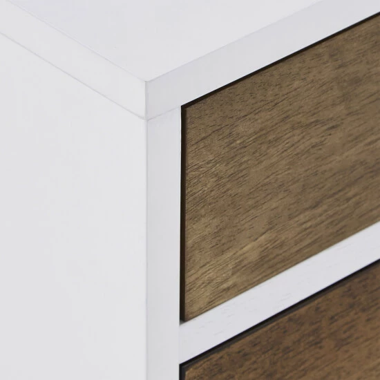 - Various shades of natural wood grain finish on the drawers with white frame