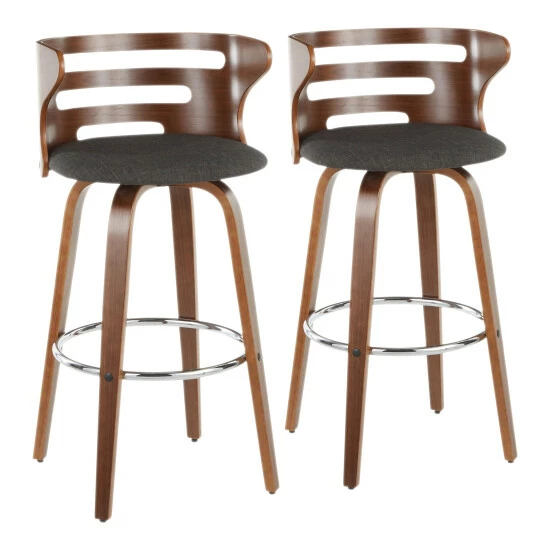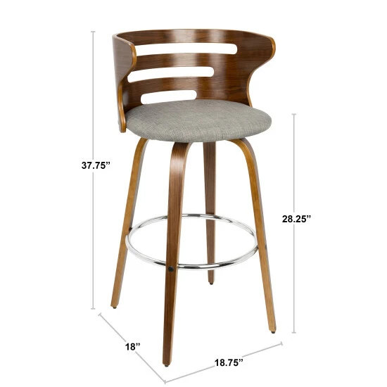 The walnut wood backrest of this barstool hugs the body with graceful, curved lines. Tapered bent wood legs are joined by a circular chrome footrest for support and durability. Add in a cushioned upholstered seat and this barstool becomes go-to seating for any group gathering.