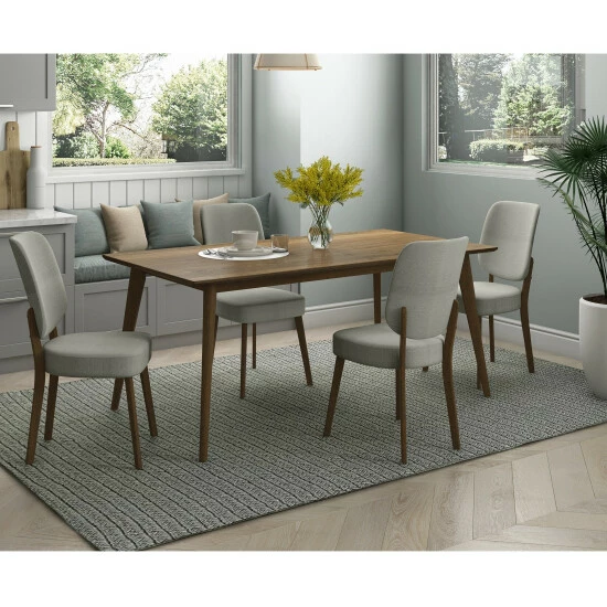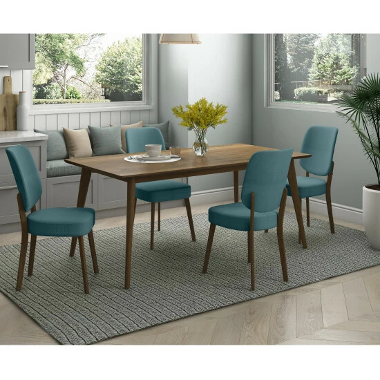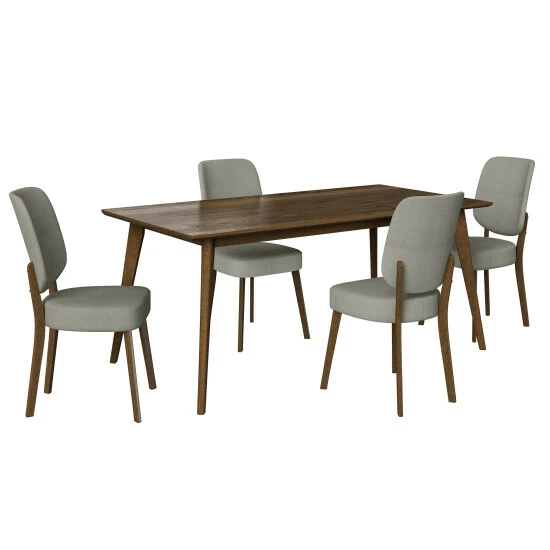 Inspired by Scandinavian design, this 5-piece dining set includes a rectangular table with a sleek beveled edge in a walnut finish and and 4 armless chairs with a upholstered backs and seats. Constructed with an engineered veneer tabletop, the table is perfect for everyday dining or entertaining in a dining room or kitchen and seats up to 6 comfortably.