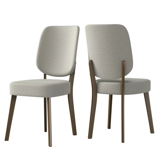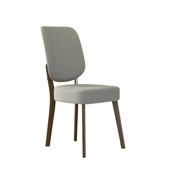 - Modern style chairs have gently rounded upholstered square backs, thickly cushioned foam seats and solid wood legs with a walnut finish