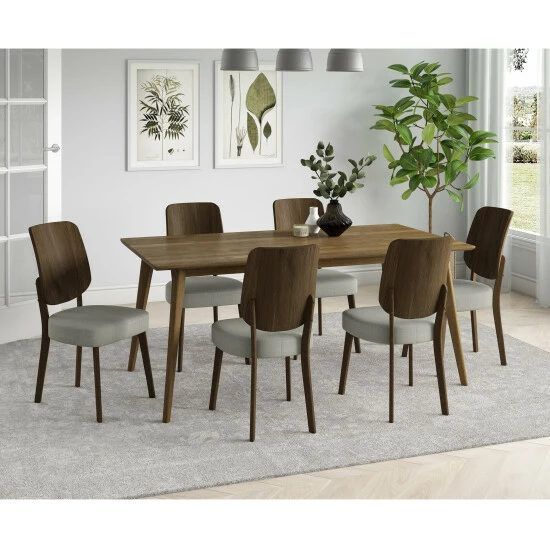 Inspired by Scandinavian design, this 7-piece dining set includes a rectangular table with a sleek beveled edge in a walnut finish and and 6 armless chairs with a wood back and upholstered seats. Constructed with an engineered veneer tabletop, the table is perfect for everyday dining or entertaining in a dining room or kitchen and seats up to 6 comfortably.