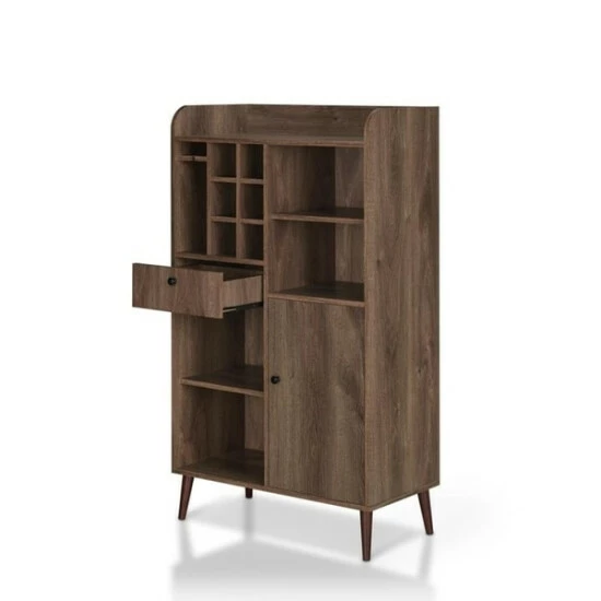 With a distressed walnut finish and mid-century modern design, this mini bar will bring a warm touch to your kitchen or dining space. A compact visual piece with a variety of storage compartments to hold all your necessities for entertaining, this beautiful addition offers it all.