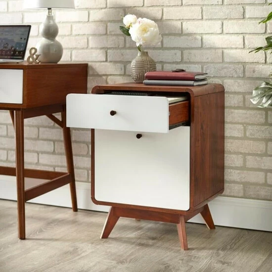 Meet your new favorite home office companion. Β The file cabinet is a charming throwback to Mid-Century modern furniture designs, marked by it’s two-tone finish, angled wood legs and rounded corners. Β It’s built with two (2) drawers: an upper drawer for printer paper, supplies and more; and a lower file drawer for storing letter-sized folders, bills and other files. Β The file cabinet is crafted of laminated particle board in a beautiful Walnut finish, contrasted by bold White drawer fronts and Black knobs. Β The legs are solid wood for stability.