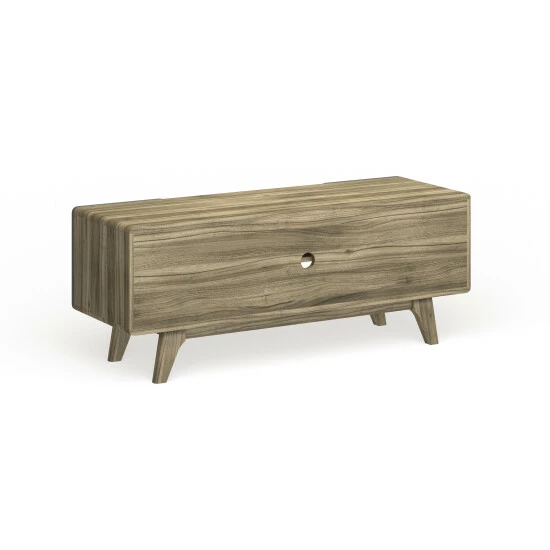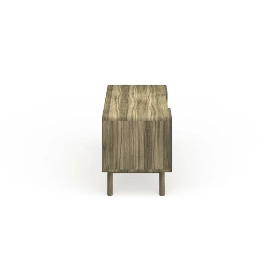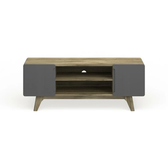 Activate the charismatic style of mid-century modern with this 47-inch TV Stand. Featuring a linear silhouette with rounded corners, Tread comes with a height adjustable center media storage shelf, durable fiberboard construction, and extra support legs for added sturdiness. Available in either walnut grain veneer with hinged white side doors or natural grain veneer with gray side doors, Tread has a look perfect for your contemporary living room decor.