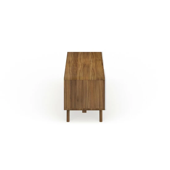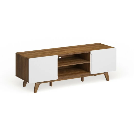 Activate the charismatic style of mid-century modern with this 59-inch TV Stand. Featuring a linear silhouette with rounded corners, Tread comes with a height adjustable center media storage shelf, durable fiberboard construction, and extra support legs for added sturdiness. Available in either walnut grain veneer with hinged white side doors or natural grain veneer with gray side doors, Tread has a look perfect for your contemporary living room decor.