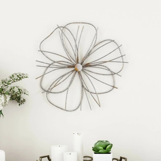 Make a modern style statement in your living space with this metallic wall decor. This nature inspired art is sure to enhance the beauty of your living spaces. The beautifully layered wire petal details add visual depth and dimension to create an elegant wall sculpture.This decorative piece features a silver and distressed gold finish that blends rustic and modern styles to add flair to bedrooms, living rooms, kitchens, or entryways. You can hang it individually or in a group for a unique display.
