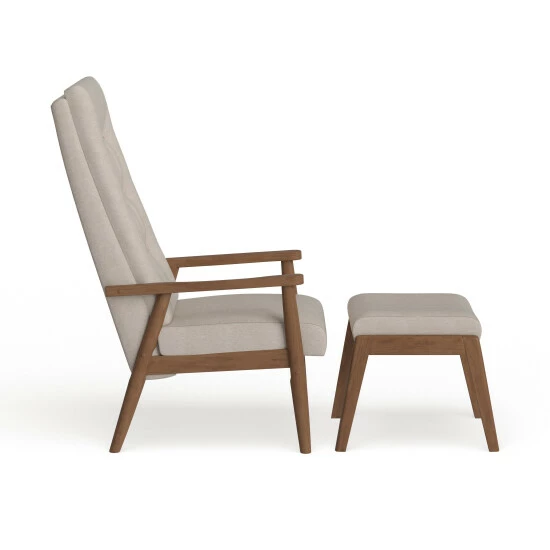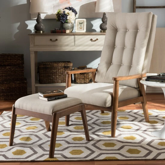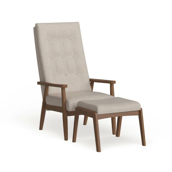Upgrade your favorite easy chair with the modern Forssa set. Constructed from sturdy rubberwood, this walnut-finished set features splayed legs, supportive armrests, and a high back. The double-cushioned seat and ottoman are upholstered in beige or grey polyester and accented with button tufting for texture.