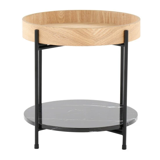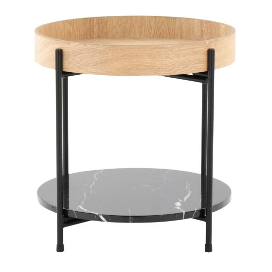 Get a mixed material modern look with the Galotti End Table. With a round natural wood top, black metal frame, and faux marble shelf, this end table will look great in any room of the house.