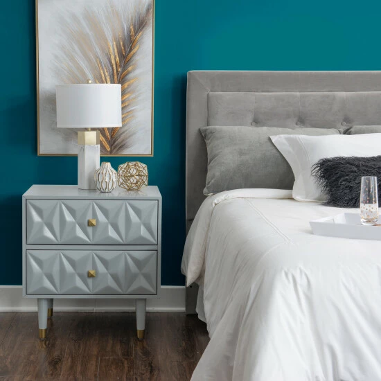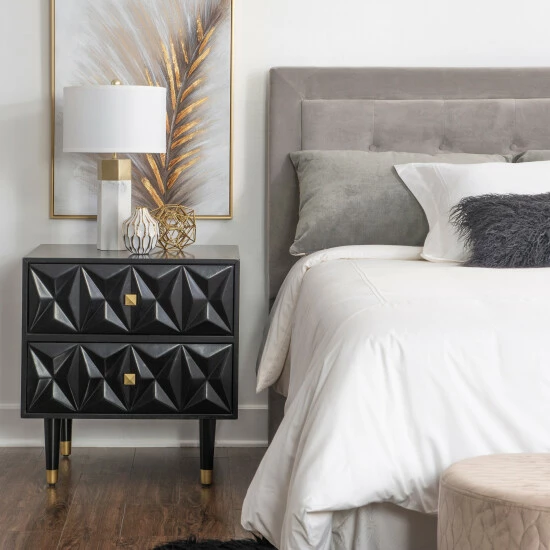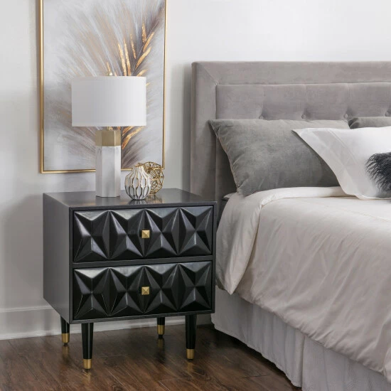 Update your bedroom with these stunning two drawer geometric nightstands. The nightstand has a full textured geometric front accented with gold dipped legs and hardware. Two deep drawers provide ample storage space for book, clothing accessories and more. The color options allow this piece to easily be incorporated into any existing dรฉcor.