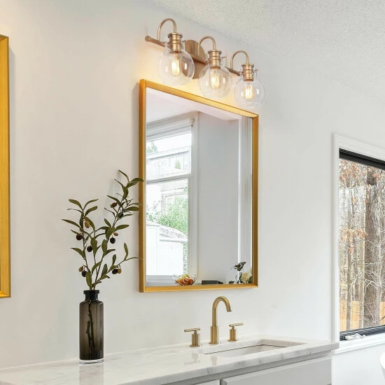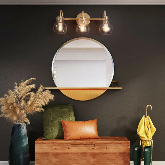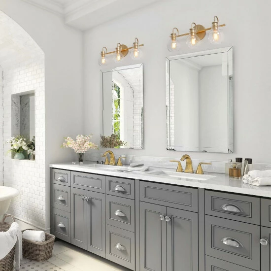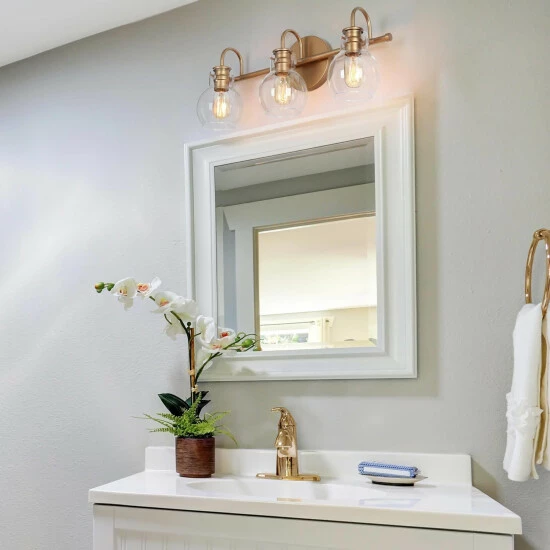 Brighten up your bathroom with the modern farmhouse look of this beautiful vanity fixture. The metal fixture is available in your choice of a hand-panted black or gold finish, and features a round backplate with a cross bar that supports the three or five lights. Arched detailing and clear, round glass hurricane-style shades complete the chic look of this vanity light.