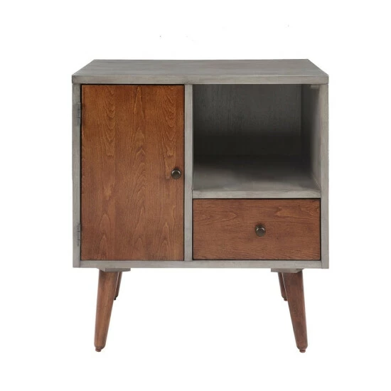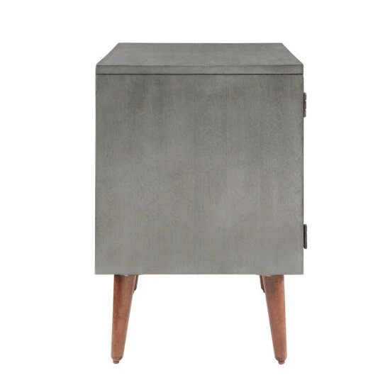 Add a mid-century modern flair to your home with this appealing nightstand. Providing extra storage, this nightstand features a cabinet drawer, a pull-out drawer, and an open cubby space to easily store your essentials. The grey hue is beautifully complemented by the pecan wood finish on the legs and doors. With a rich and striking contrast, this wood nightstand is sure to breathe new life into your bedroom decor. Leg assembly is required.