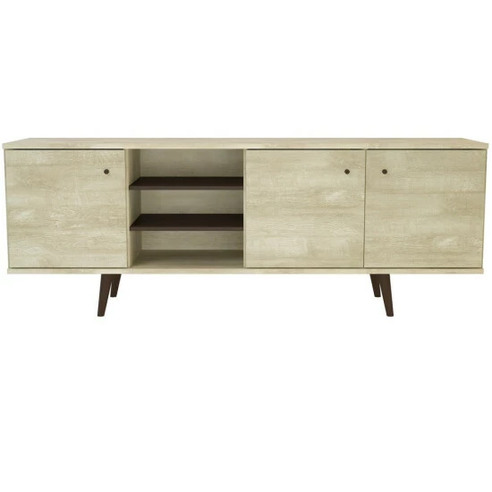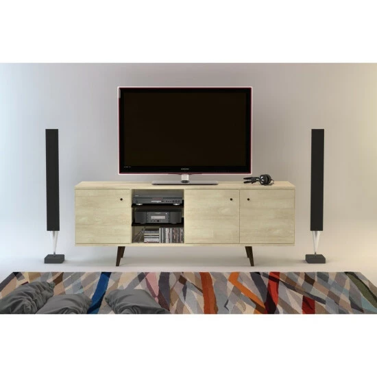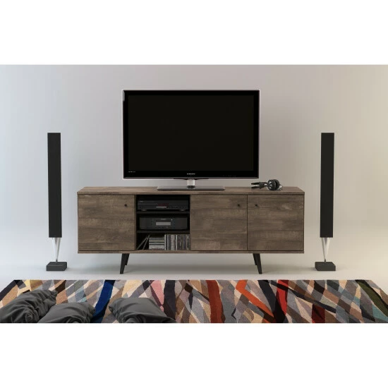 Never lack for storage and style with the Hitra TV stand from Carson Carrington. Available in a distressed brown or sand finish, this stand features three cabinets for storage, holes for cord management, and an intriguing mid-century modern design.