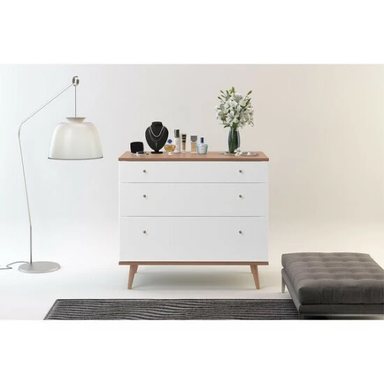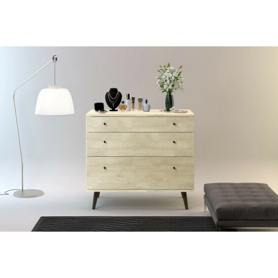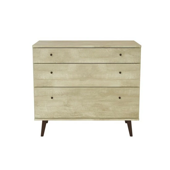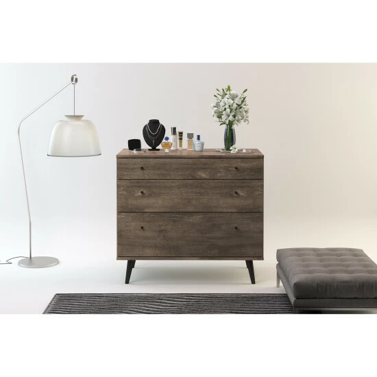 This mid-century 3-drawer dresser is a splendid addition for every home and will give your bedroom the class and elegance you are looking for. This product combines coziness, glamour, comfort, and an affordable price. The dresser is made of 100% MDF (Medium Density Fiberboard) and comes in either a Distressed Brown or Sand color. MDF is a high grade, composite material that performs better than solid wood in many areas. Made from recycled wood fibers and resin, MDF is machine dried and pressed to produce dense, stable sheets. This contemporary product is the key aspect for an elegant bedroom area. It is easy to assemble, ships in 2 boxes and has a 2 year limited warranty against manufacturing defects.