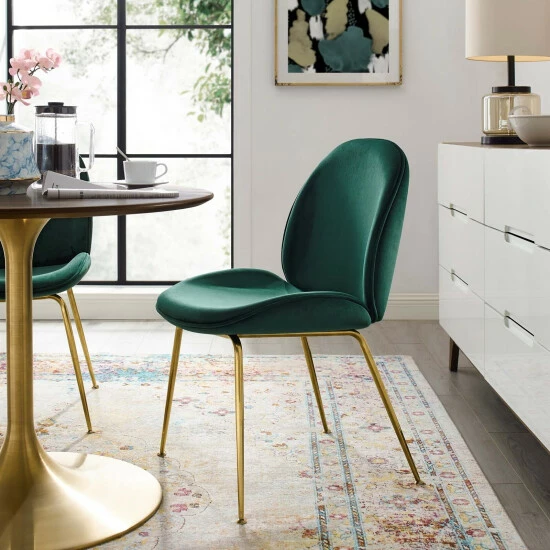 Breeze into vintage glamour decor with the whimsical Scoop dining chair. Supported by a splayed gold stainless steel frame, Scoop comes with a soft, stain-resistant performance velvet polyester upholstery for a unique addition to your dining room decor. Padded in dense foam, Scoop features simple curves and a sleek, minimalist frame that combine to deliver a velvet chair perfect for all your dining needs. Complete non-marking foot caps, transform your kitchen or dining room decor today with this cheerful and elegant dining side chair.
