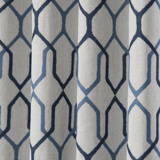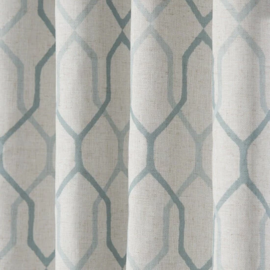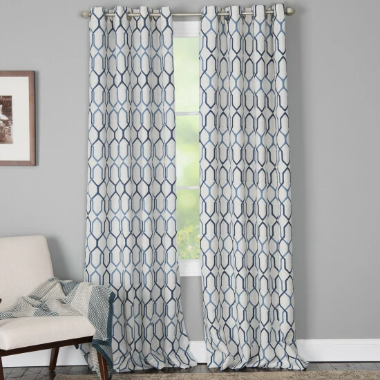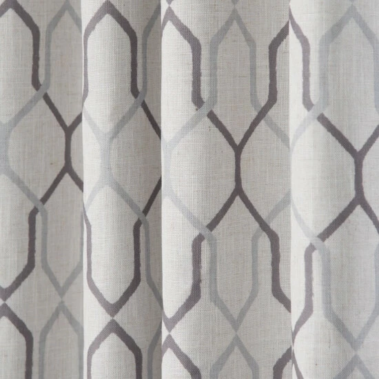 This grommet top energy saving panel features a printed interlocking design. Grommet top energy saving panel with a geometric design . Lined. 95% Polyester / 5% Linen with 100% Polyester lining . Separate thermal lining adds energy savings and light blocking properties. Polyester linen blend . Noise dampening. Grommet top allows for easy installation and functionality. Install on up to a 1-3/8 in curtain or decorative rod. Fade resistant. Machine washable. Each panel sold separately.