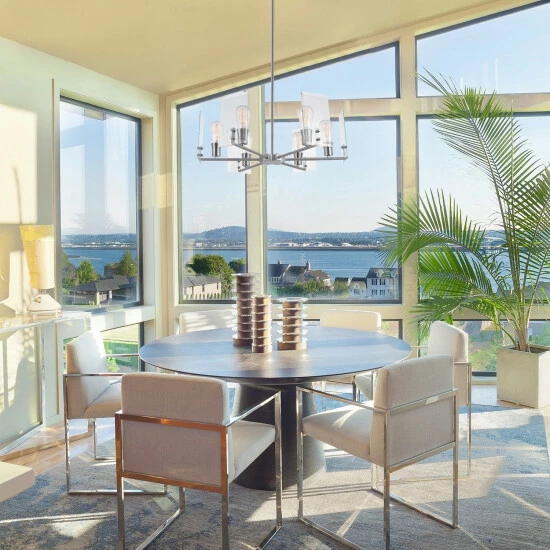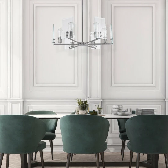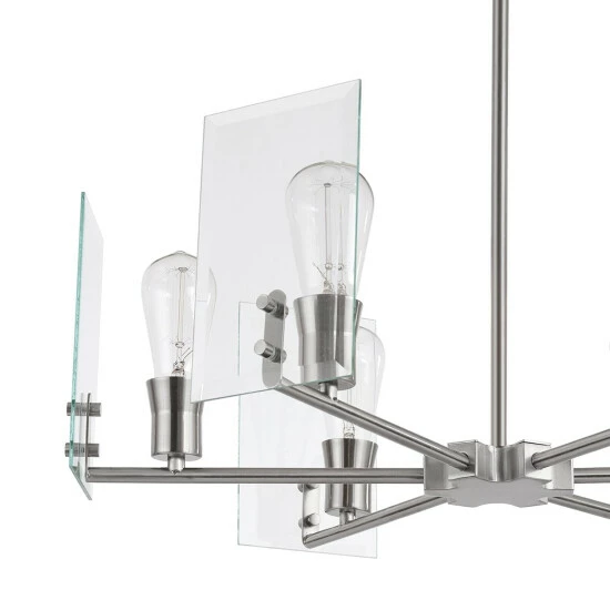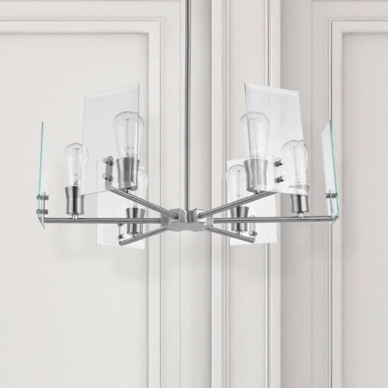 This 6-light chandelier is the perfect combination of industrial and contemporary style. It features brushed nickel and clear glass finish. A beveled glass pane sits in front of each exposed socket to create a gorgeous contemporary look that accents any interior design style. This lighting fixture is fully dimmable with a compatible dimmer switch to create the perfect atmosphere.