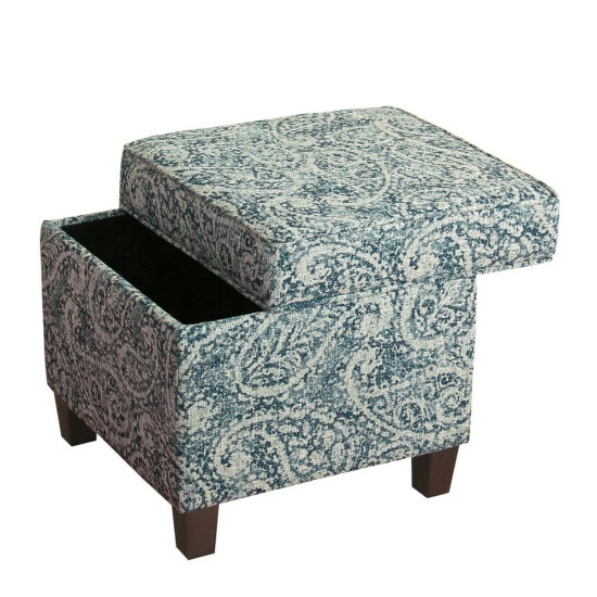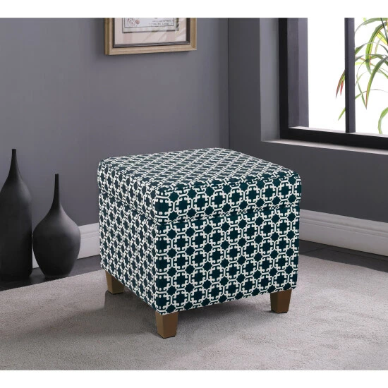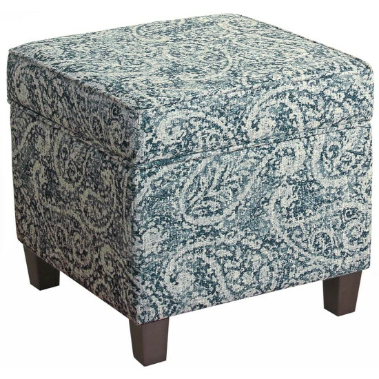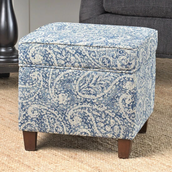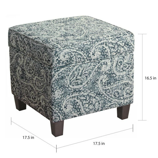 Elevate your home with this versatile ottoman. Our classic square ottoman is perfect for smaller spaces or paired two together at the end of a bed or around a living room. Featuring a navy lattice print, or paisley pattern, this stylish and functional accent piece always attracts attention. With a lift off lid to easily hide things away, our square storage ottoman is complemented by wood legs in a dark walnut finish. All of our ottomans are easy to assemble and maintain.