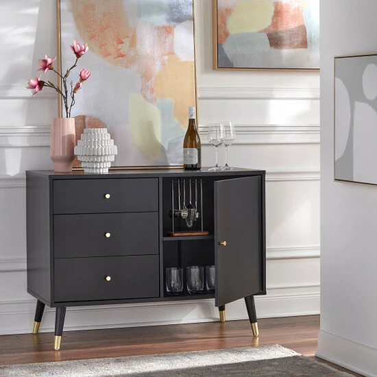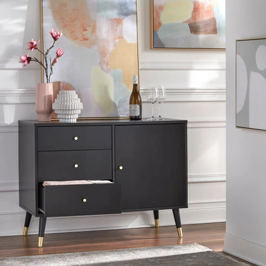 This hip buffet is perfect for your dining room, living room, or bedroom alike. Three drawers and a large cabinet provide space for storing all your dining room and hosting necessities, and the top is perfect for displaying decor pieces. The splayed, tapered solid wood legs complete the buffet’s charming mid-century design.