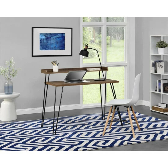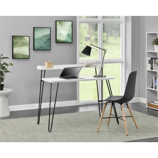 Refresh your home office with this retro desk and riser. Available in a white or medium brown woodgrain finish with black powder-coated metal hairpin legs, the desk and riser evoke the casual elegance of mid-century style. The desktop offers a spacious workplace, while the riser keeps useful items close at hand.