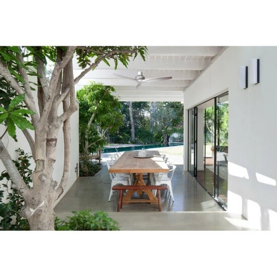 This 52-inch indoor-outdoor ceiling fan boasts an innovative design that is made of extremely durable material. Five motor colors and ten blade finishes will mix and match to your exact preference.The fan is made with aluminium, stainless steel screws, poly carbonate and real wood blades.