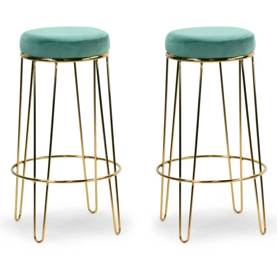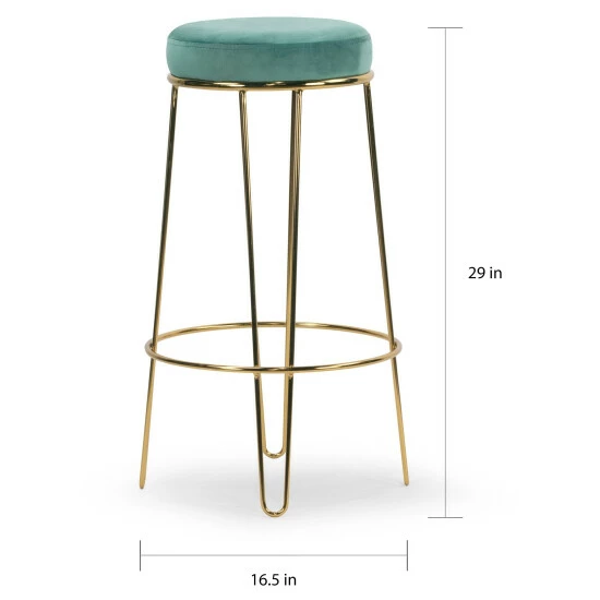This turquoise barstool could end your search for a unique stool. Round armless design and geometric legs are a statement of modern itself. Foam seat is upholstered with turquoise velvety fabric. Sturdy metal legs are gold tone brushed. Steel frame and legs come as one piece for easy assembly. Minor assembly needed. Spot clean recommended.