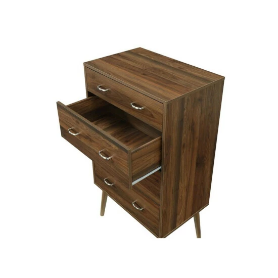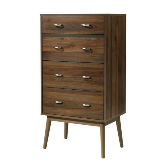 4 Drawer Mid Century Modern Chest.This stylish 4 drawer Chest is an excellent addition for every home and will giving you that added elegance.This finely crafted product combines style and function at an affordable price.Drawer fronts are accented with brushed metal pulls,metal drawer glides, and is finished with a durable espresso laminate.The uniquely designed tapered legs are made of solid wood for added durability.Clean with a dry non abrasive cloth.Comes ready to assemble with the necessary hardware and step-by-step instructions.