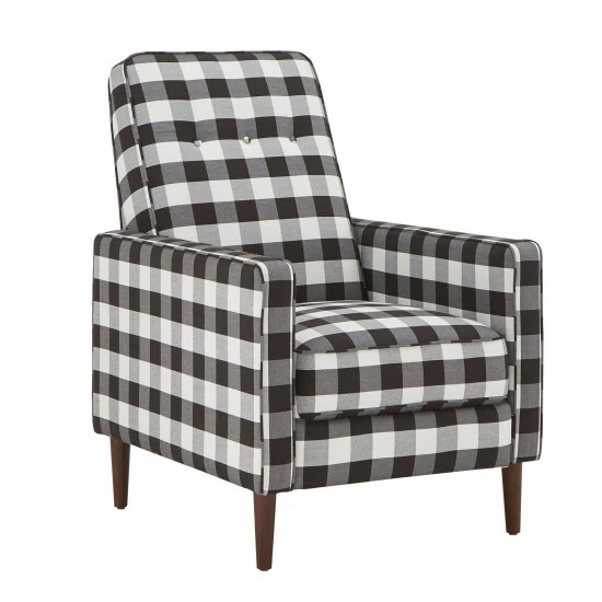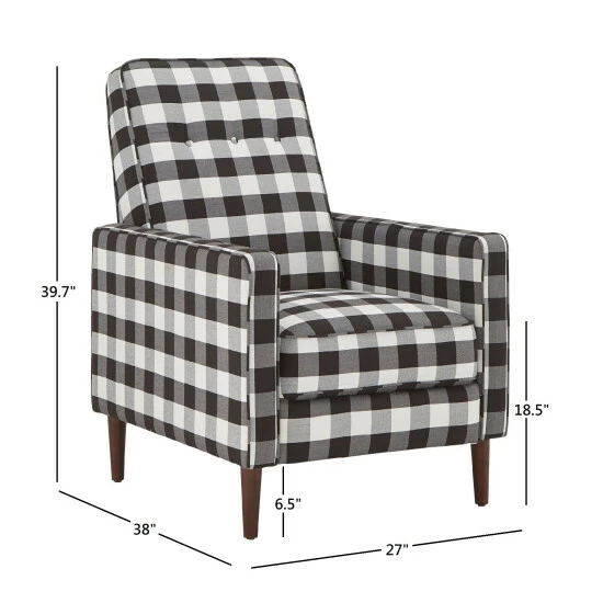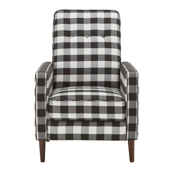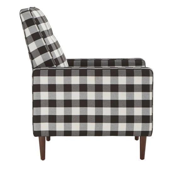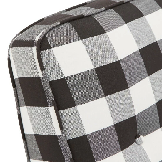 A warm and cozy feel within your living space is easily displayed with the addition of this black and white buffalo check plaid chair. The foam filled seat provides a comfortable place to kick back and relax after a long day, and the chair back is accented with delicate button tufting, adding even more style points to this eye-catching seating piece. This chair also shows off a retro-inspired silhouette, while a warm, cherry wood finish completes the chair’s peg legs, giving it overall sturdy support. With its’s soft buffalo check plaid fabric, this chair gives off an inviting presence and looks great when placed within a farmhouse styled space.
