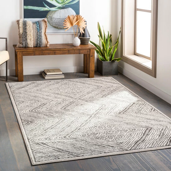 Imbue your family room with the captivating and glacial allure of this rug’s Scandinavian-style motif and cool color palette. The rug’s diamond and geometric-theme pattern is hypnotically beautiful as it spruces up the high-low texture, pairing ideally with the rug’s elegant sheen to deliver a superb decorative addition to a modern interior. This latex-free rug is exceptionally suited for use in busy, high-traffic areas thanks to its resilient machine-made construction and low-cut pile, while its meld of polyester and polypropylene fibers allows for a simple and easy care.