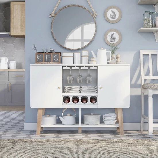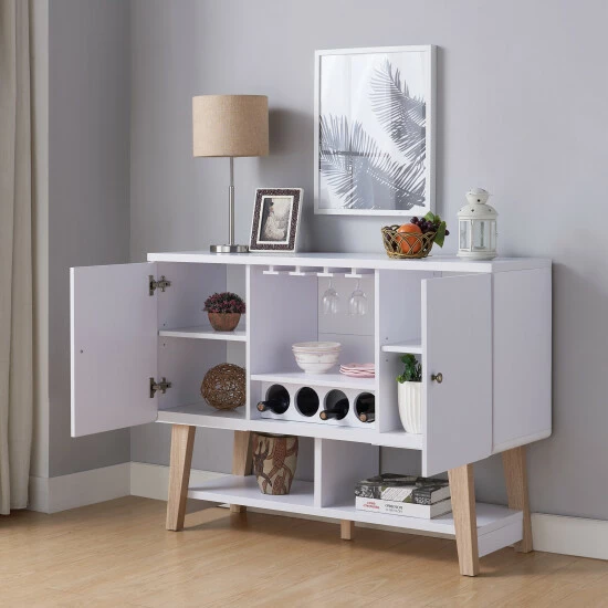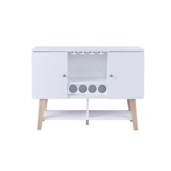 Entertain, store, organize, and stylize your dining space in dashing, mid-century modern style, with this fabulous buffet server. The two-tone frame boasts open shelving, two cabinets, and angled legs. Store your favorite glasses and wine bottles in the center storage area.