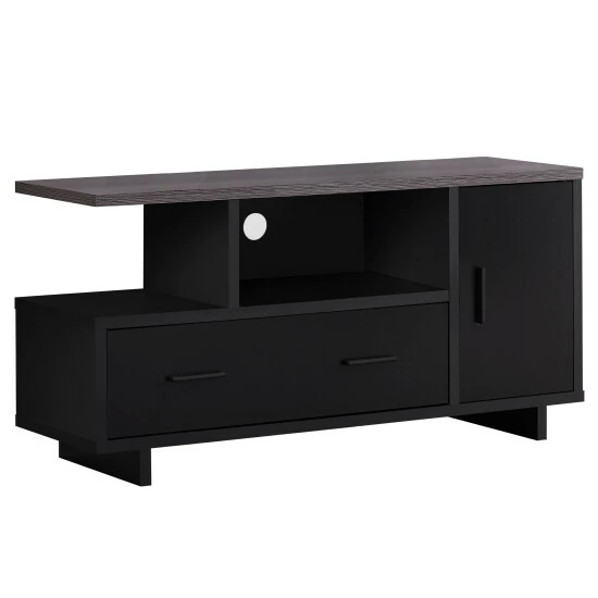 Let this contemporary style two-toned TV stand take center stage in your entertainment space! Finished in a rich black with a contrasting grey 48 inch long top, this TV stand can hold any size TV when centered. The 2 open shelf spaces can easily store your audio/visual equipment; the closed cabinet and large gliding drawer accented with sleek black plastic handles will keep other accessories organized and out of sight. A handy pre-drilled wire management hole in the center keeps your wires neatly in place. Assembly is required.