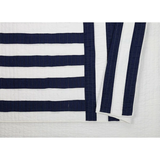 Carson Carrington designs a bold pieced quilt in two colors. Sections of navy and white stripes uniquely pieced in alternate directions create a dramatic visual effect. Shams are in solid navy accented with white piping to compliment the quilt. Add this ultimate statement piece to your bedroom to create that modern vibe. Finished with a horizontal channel stitch. Quilt set includes 1 quilt and 2 shams. 100% Cotton, machine washable.