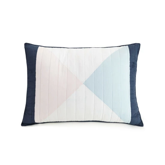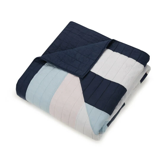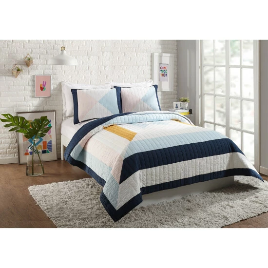 This Carson Carrington pieced quilt makes a big statement in large blocks of color in a geometric pattern. Alternating sections of blue, pink, gold and navy mix with white to create a bold look. A new spin on a traditional pieced quilt is the perfect accent to add a modern element to your bedroom. Finished with a simple channel stitch. Quilt set includes 1 quilt and 2 shams. 100% Cotton, machine washable.