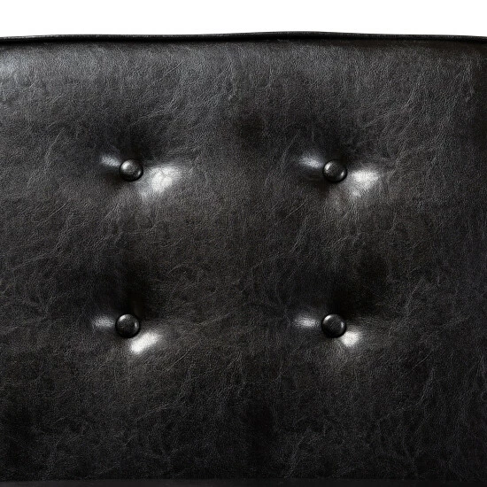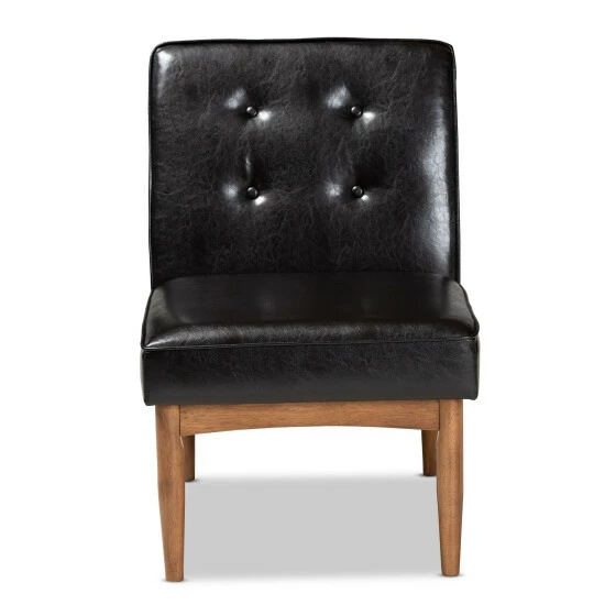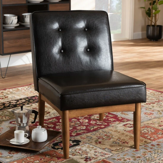 Sit back in style with the bold and graceful design of this charming dining chair. The chair is constructed from wood in a walnut brown finish and fitted with dark brown faux leather that is easy to coordinate with a wide range of color palettes. Inspired by stylish mid-century modern design, the chair showcases button tufting and tapered legs.
