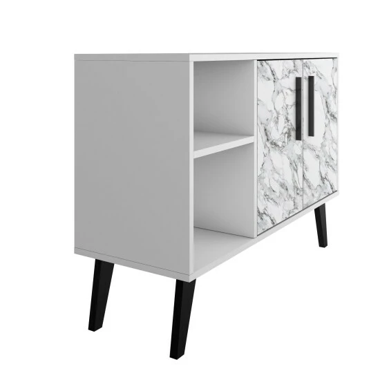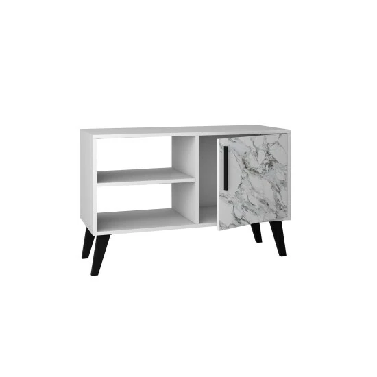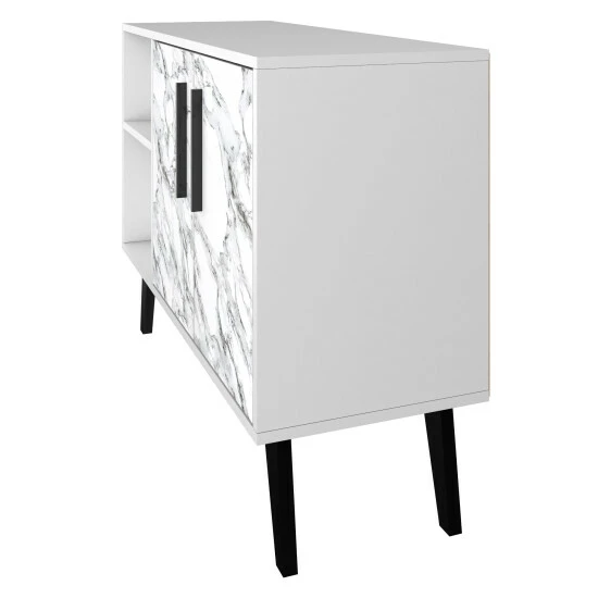This TV stand is really part buffet, console, and living room focal point all in one. Expert craftsmanship and design come together to bring this Mid-Century Modern piece to life. Two open shelves allow for the perfect display to showcase vases, media accessories, and make it easy to store away items in baskets or bins that slide in and out. A concealed shelf tucks away albums, dishes, tablecloths, and beyond. Versatile and functional, this cabinet blends well with any existing decor and will serve as the mainstay of any space. Prop a TV on top or keep it neutral with a decorative tray and vase, either way, it is bound to become a quick favorite in your home.