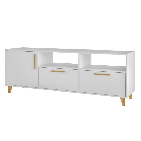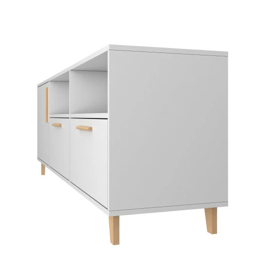 Invite your friends and family over for the greatest movie night in. The ultimate entertainment center without compromising on style or sophistication, the Herald TV stand is Mid-Century Modern at its best with ample storage space for tucking away albums, all your media essentials, with plenty of concealed shelving and two elongated open shelves for displaying gaming consoles, DVD players, remotes, and more. Two lower shelves stay hidden behind sleek pull-down style doors and ensure all items stay organized.