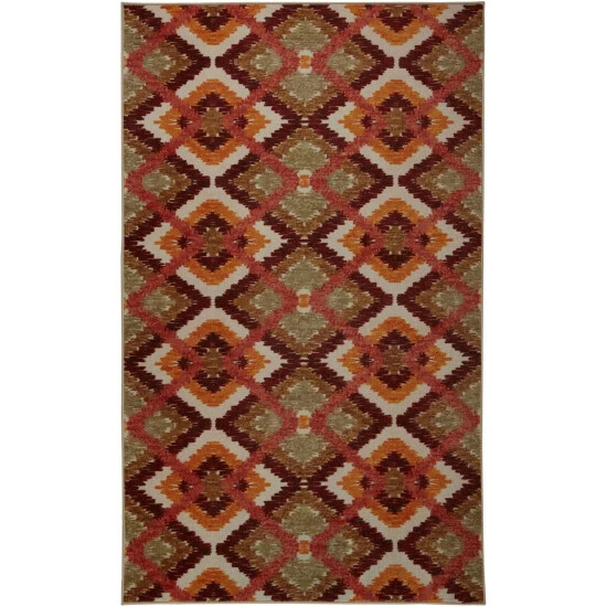 Multi-sized diamonds of maroon, gold, and pink are spread across a greyish-blue background on the Kartong Area Rug. This versatile rug is ideal for a contemporary dining, living, or bedroom.
