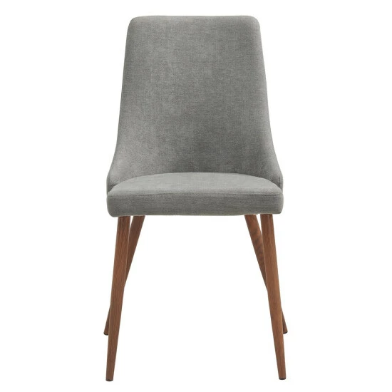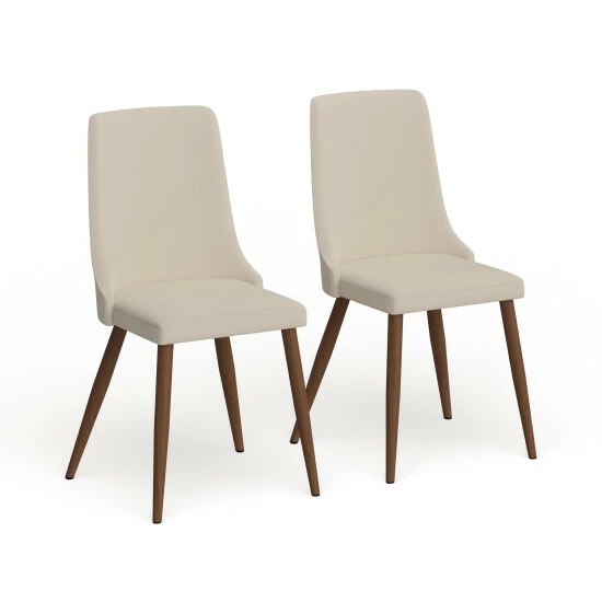 Add some extra seating to your dining room or living room with this set of ultra-stylish chairs. These chairs feature upholstered seats with curved backs and tapered wood-look legs for a distinctive mid-century flair. Choose from beige or grey fabric upholstery to best match your decor.