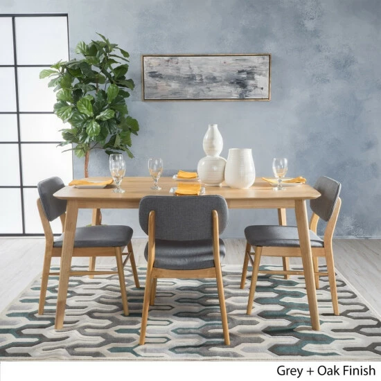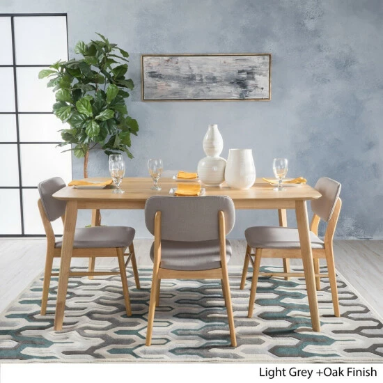 Infuse your dining room decor with a touch of mid-century modern style with this 5-piece dining table set. In your choice of walnut or oak finish, this set includes a large, rectangular table with four upholstered chairs for friends and family.