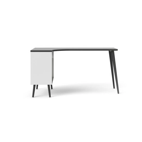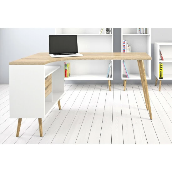 Get to work in modern style with this sleek, Scandinavian desk from Carson Carrington. The engineered wood frame features an oak or black matte-finished table top and a white base with three open shelves and two drawers.